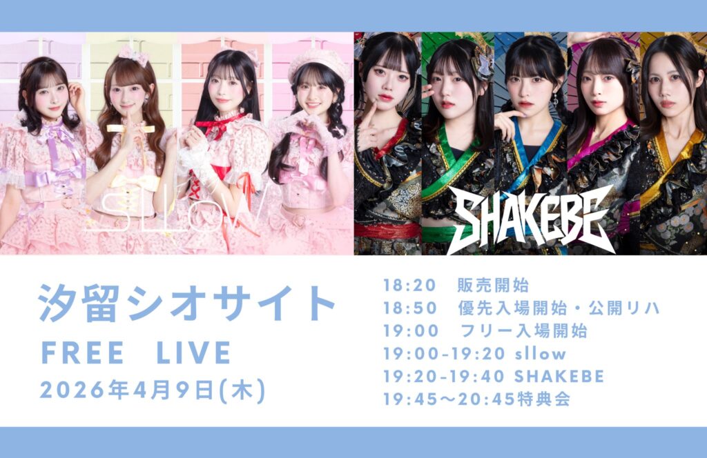2026/4/9(木)に開催いたします。sllow×SHAKEBE合同フリーライブの詳細をお知らせいたします。