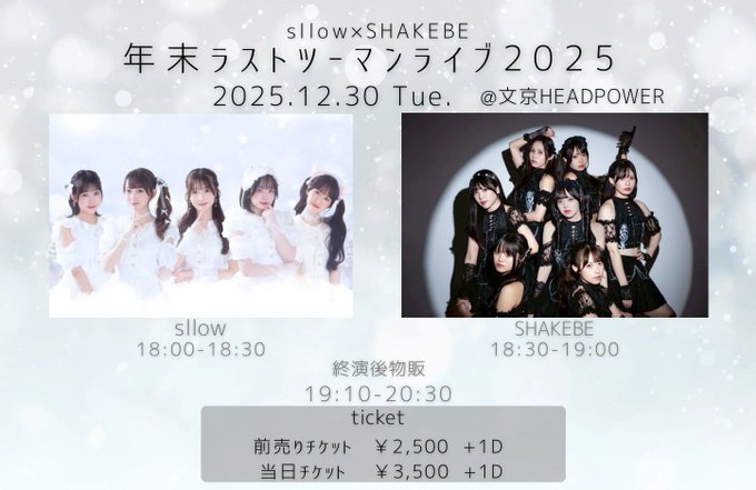 2025/12/30(火)に開催いたします、sllow×SHAKEBE年末ラストツーマンライブについての詳細をお知らせいたします。