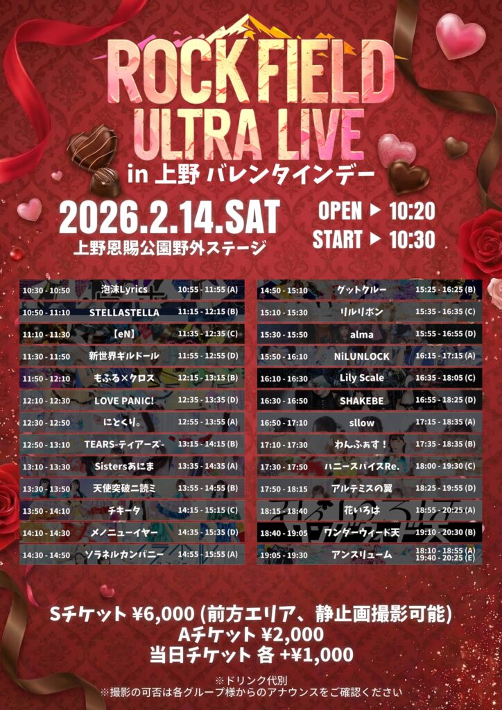 2026/2/14(土)に開催いたします、rock field ULTRA LIVE in 上野 バレンタインデー 出演についての詳細をお知らせいたします。
