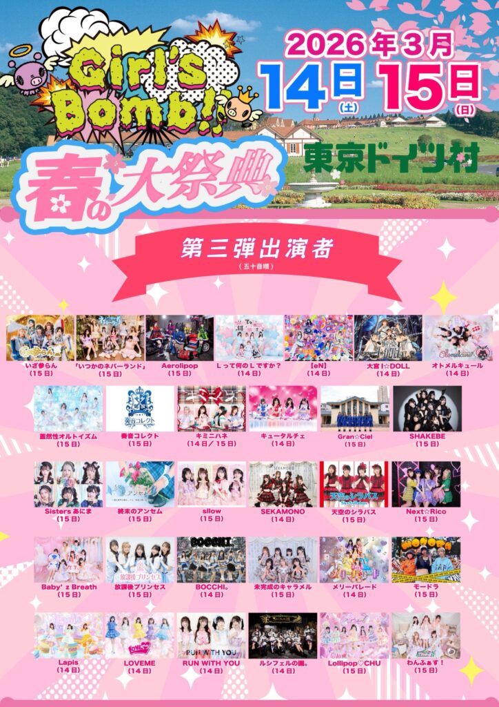 2026/3/14(土)、3/15(日)に開催いたします、Girl’s bomb!! 春の大祭典 @東京ドイツ村出演についての詳細をお知らせいたします。